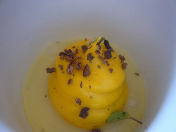 Si comincia con il gelo di mandarino, ganache di ciocco bianco e pasticcera alla zucca per proseguire con il clou
