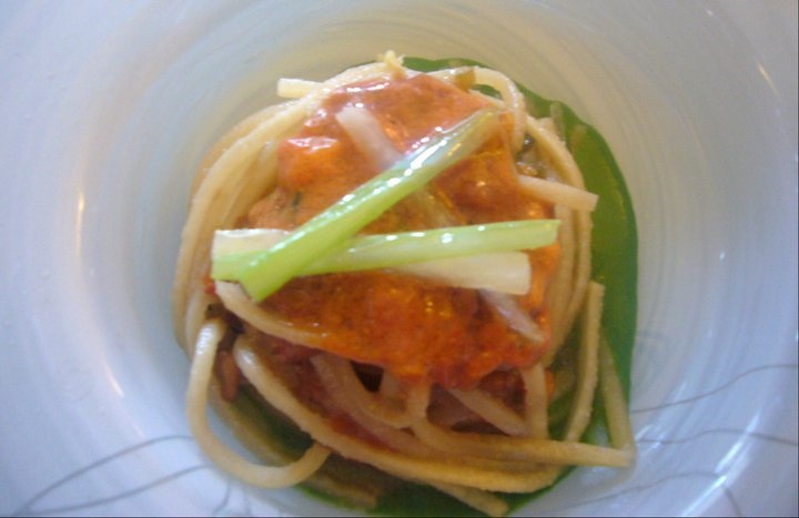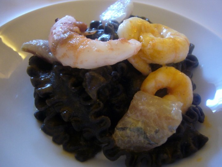 Lasagne ricce al sugo nero di seppia con gambero gobbetto, cicala di mare, sugherello alla senape e trippa (lampredotto) piccolo omaggio al mangiare in dialetto