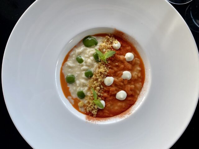 Risotto Caprese: pomodoro, basilico, mozzarella di bufala, pane cafone, burro, parmigiano, sedano, carote e cipolla
