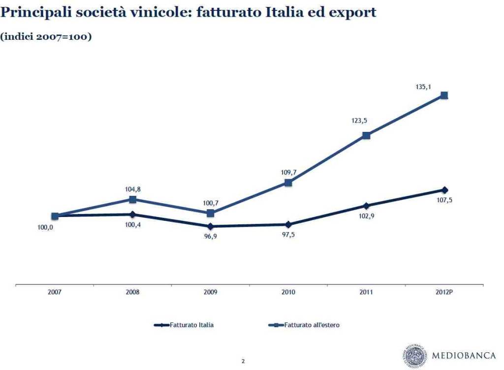Investimenti tecnici nel 2012: in ripresa del 10%, dopo la forte flessione del 30,1% subìta nel 2011; gli investimenti pubblicitari del settore vinicolo sono in crescita del 6,5% (quelli nazionali sono caduti del 14,1%);