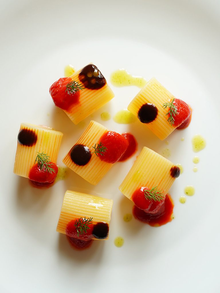 Onofrio Pagnotto del Ristorante I Tenerumi a Vulcanello, partecipa a Primo Piatto dei Campi 2022, iniziativa siglata da 50 Top Italy e Pastificio dei Campi, con Raspi, Aglio e Pomodoro.