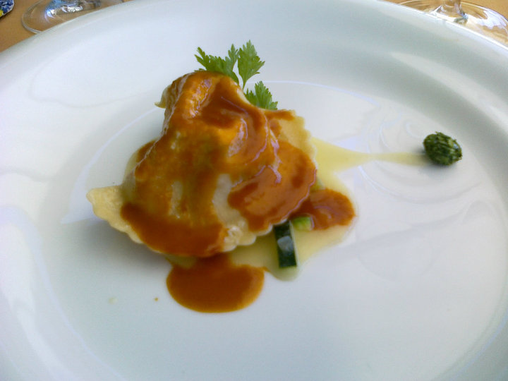 Tradizione: Parmigiana in scatola di spaghetti, piccoli canneloni ripieni di robiola di bufala, filetto di San Pietro scottato con farina di peperone di senise, soufflé di limoni della costiera con sorbetto ai lamponi e birra.
