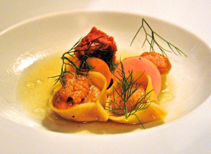 Ravioli di potimarron, ricci, brodo di zucca butternut e olio di Tagete