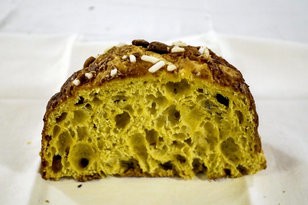 (la ricetta classica milanese: impasto realizzato con lievito madre, farina, uvette e canditi di agrumi in sospensione, burro, tuorli d’uovo, zucchero; taglio a croce in cima, niente glasse)