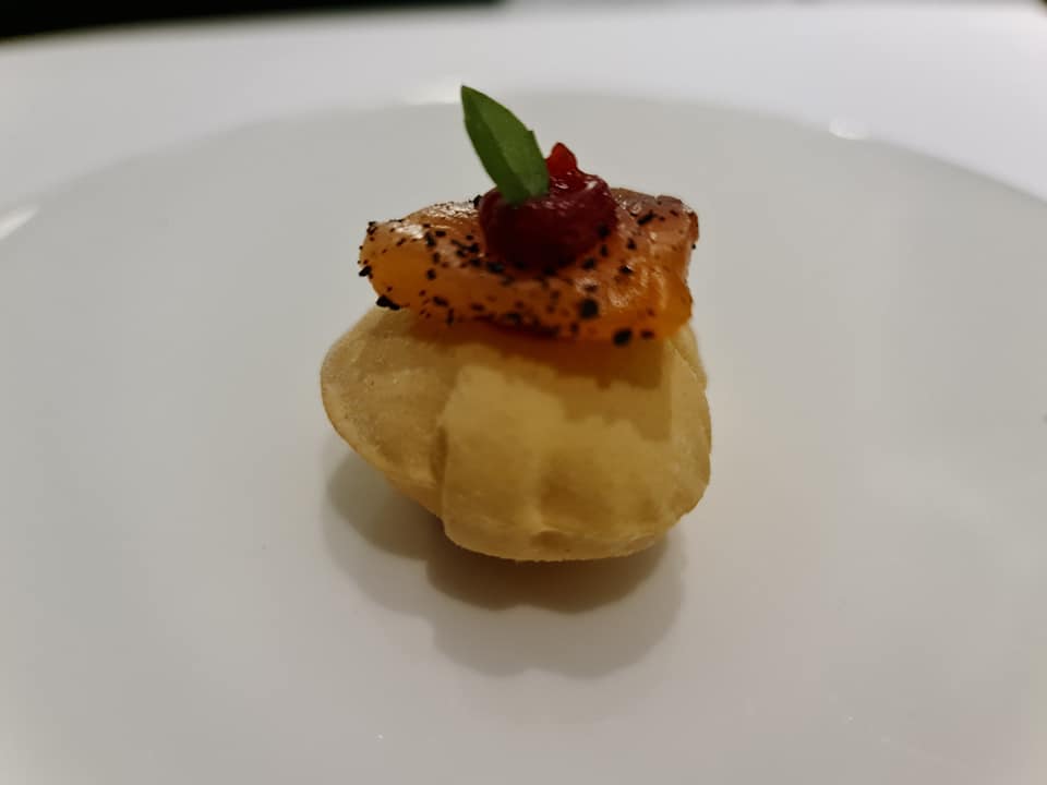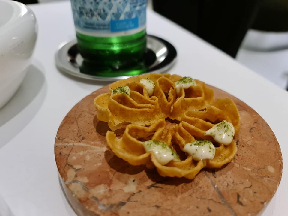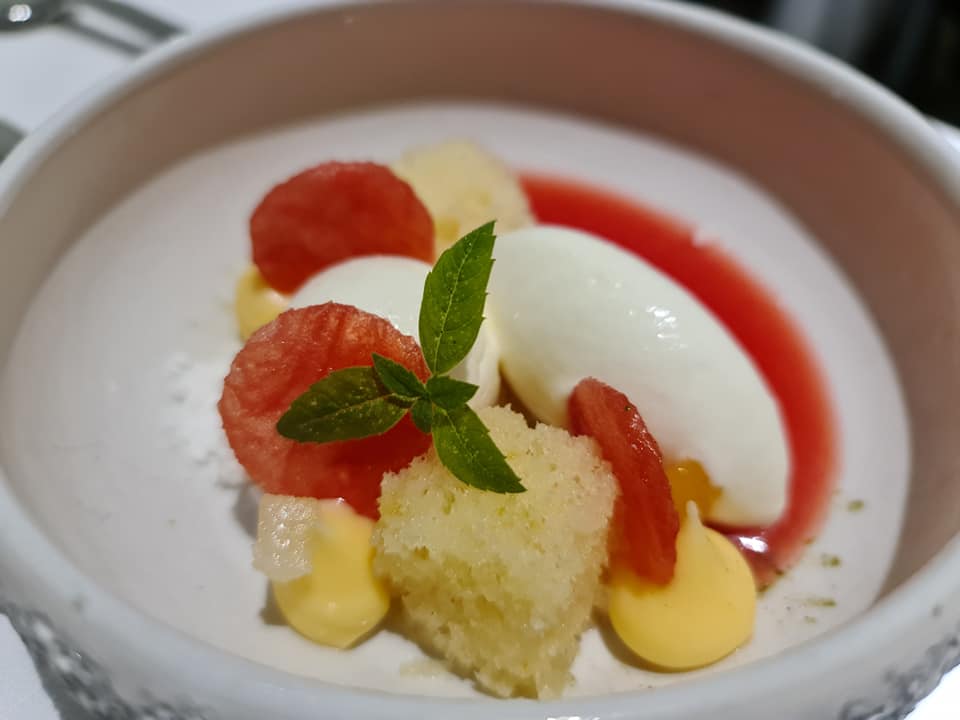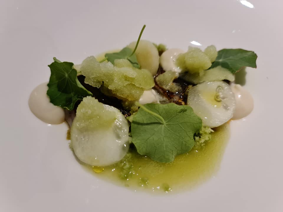 Il benvenuto della cucina spazia dalla cozza alla melanzana, bocconi singoli molto golosi. Il pane è fantastico, uno dei migliori che si possono trovare in circolazione in questo momento. Lo chef campano è da sempre un grande appassionato di lievitazioni e lo si percepisce tutto. Sgombro, mela verde, cetrioli, sedano e alghe, frisella (realizzata in casa in realtà è una polenta) gambero, musetto e anguria, sono la somma di tutti i ragionamenti sulla cucina. Centrati, non perdono la golosità, l’acidità è una costante precisa e voluta.