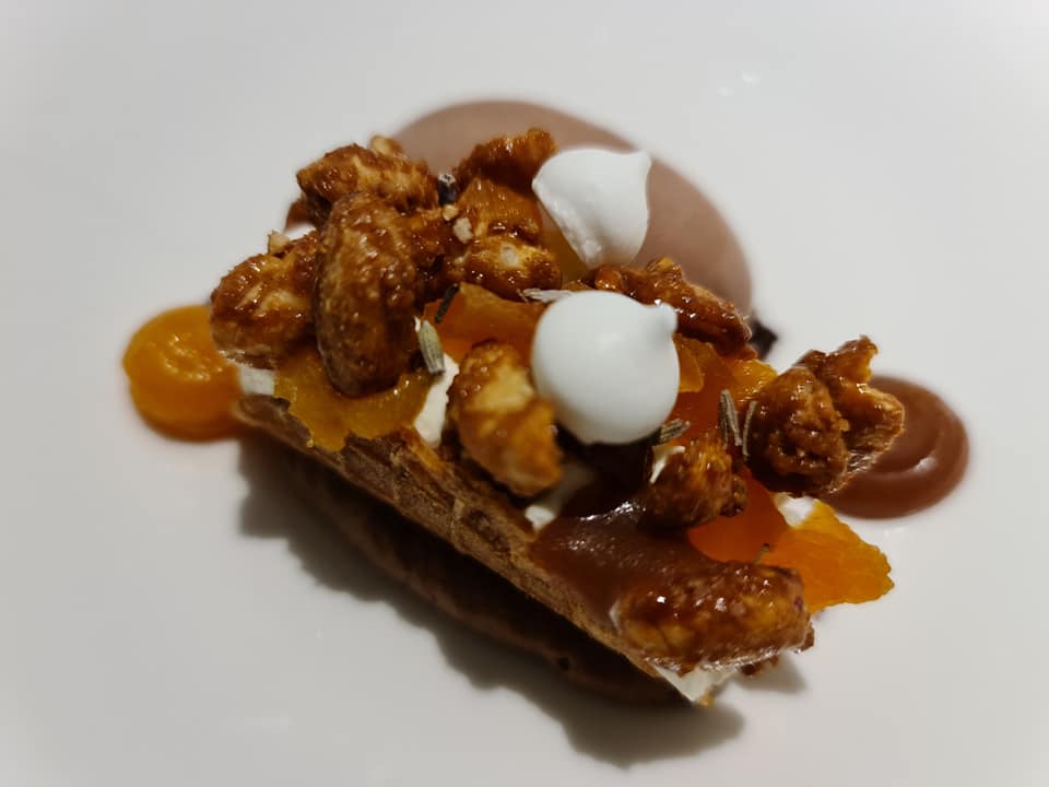 Il risotto, mozzarella, acciughe, limone e tartufo estivo è meno intrigante della pasta secca, di solito sono per togliere, ma in questo caso avrei aggiunto una leggera nota balsamica al piatto, magari con qualche erba, più che con il tartufo. L’astice, zucchine, basilico e mandorla è il piatto meno nelle mie corde di tutta la cena, sia dal punto di vista estetico, che da quello del gusto, c’è sicuramente qualcosa da ritarare.