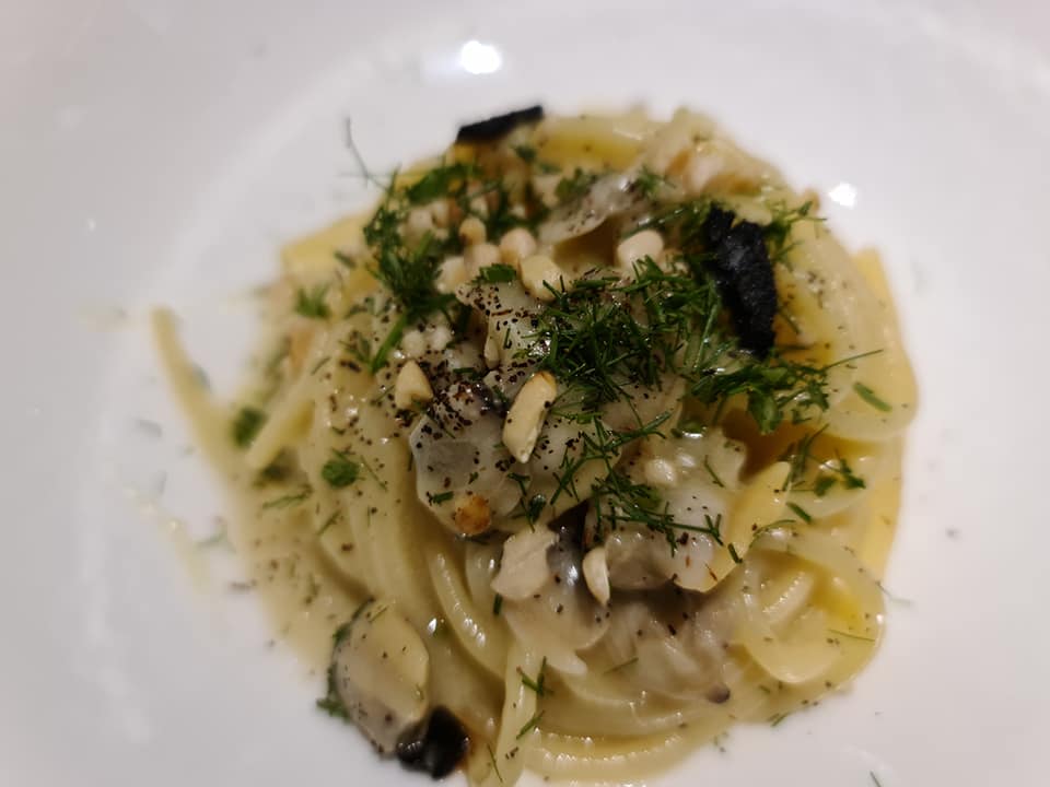- spaghetti alle vongole, finocchietto, pinoli e aglio nero