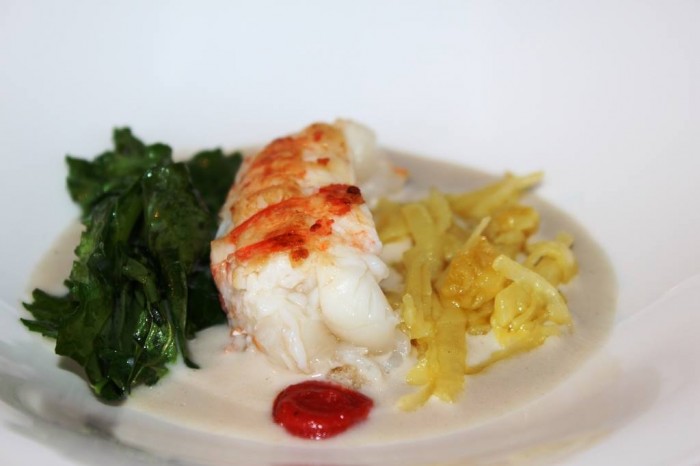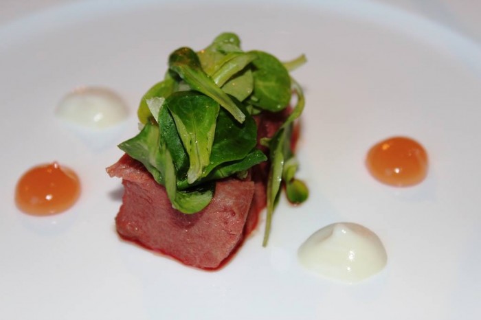 Partenza a mille, un fondo fatto con le lische della spigola cotte nel latte e poi emulsionate con l’acqua. Taglio chirurgico e cottura millimetrica per la spigola, il tartufo bianco con la nota terragna, usato da esaltatore del gusto non la copriva, anzi ne amplificava le nota marina, la salsa leggera non apportava note grasse invasive e non asciugava il palato. Piatto che rasenta la perfezione.
