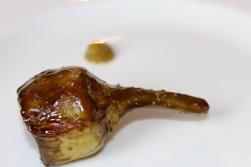 Io che vengo da Paestum quindi da terra di carciofi mi sono innamorato di questo piatto, perché nella tradizione il carciofo viene sempre accompagnato dalla pancetta o dal pane raffermo, dal formaggio, e di solito da tanto aglio, dipende dalla preparazione, smorzandone e coprendone spesso il gusto. In questo piatto il carciofo è cotto sottovuoto per circa 60 minuti, passato in padella, poi nel forno e successivamente laccato con una riduzione del carciofo stesso e resina di rosmarino, un concentrato di rosmarino accompagna il piatto. Note vegetali su note vegetali, note che ricordano il gusto dell’ acciuga e della liquirizia. Carciofo in purezza.