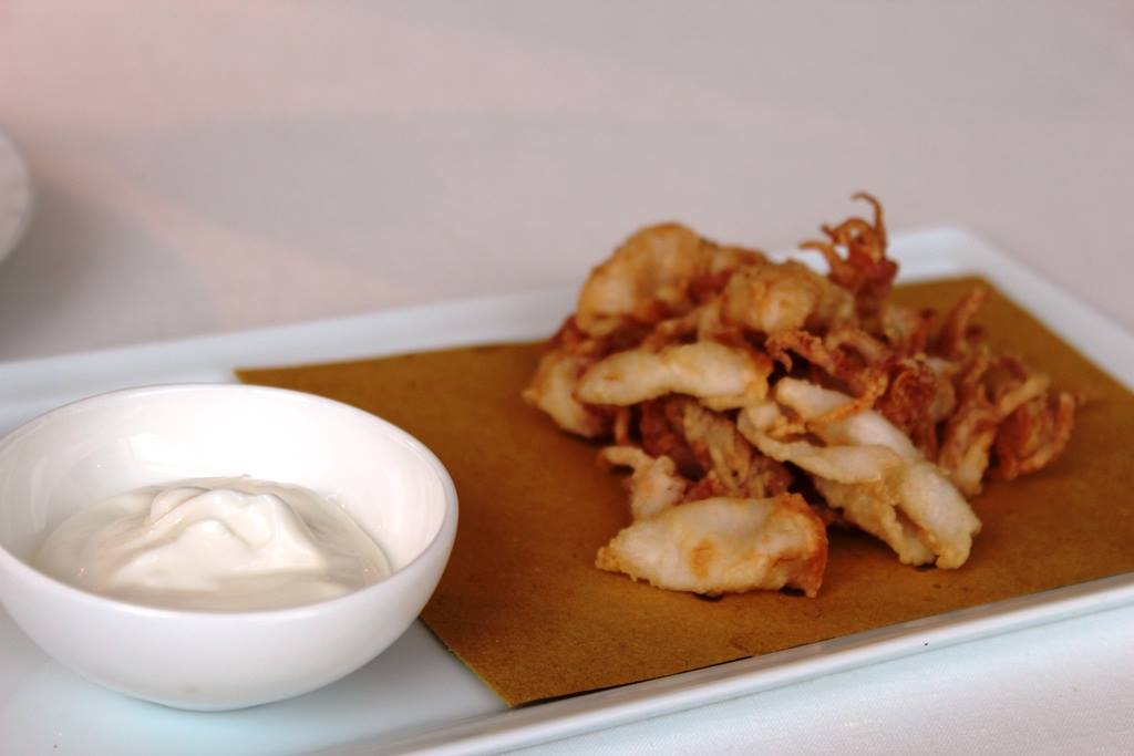 La classica zuppa di cipolle, in una versione 2.0. Gli equilibri e le sfumature sono molto sottili, la dolcezza dell’estratto di cipolle, la sapidità dei bottoncini di Parmigiano Reggiamo, i pistilli di zafferano allungano il piatto conferendogli un carattere molto deciso, stimolando il quinto gusto in maniera energica, la temperatura di servizio perfetta completa il piatto.