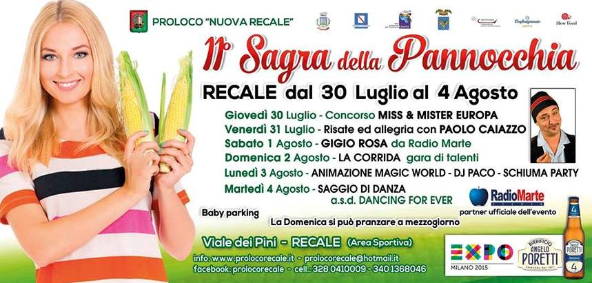 La pannocchia a metro zero torna protagonista a Recale, in provincia di Caserta, con sei giorni di festa. Da giovedì 30 luglio a martedì 4 agosto 2015 si svolgerà la nuova edizione della tradizionale sagra della pannocchia organizzata e promossa dalla Pro Loco “La Nuova Recale” in collaborazione con Slow Food Caserta e patrocinata dal Comune di Recale, dall’Ente Provinciale per il Turismo, dall’Ente Provincia, dalla Regione Campania, da Agrisviluppo azienda speciale di Camera di Commercio e Confartigianato.
