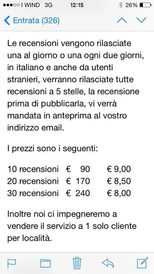 Tariffe recensioni 30/8/2015 Torna a: Ohhh, finalmente le tariffe per le recensioni truccate in saldo! Tariffe recensioni