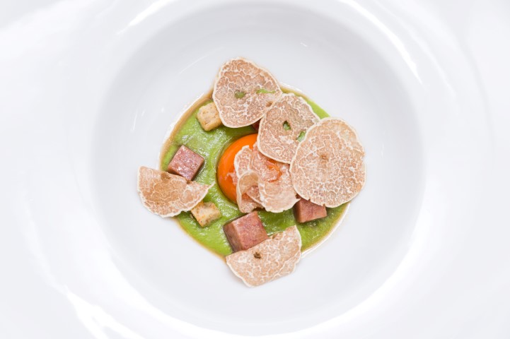 Confit Egg Yolk. crispy bread, cream of broccolini and cotechino, Alba white truffle