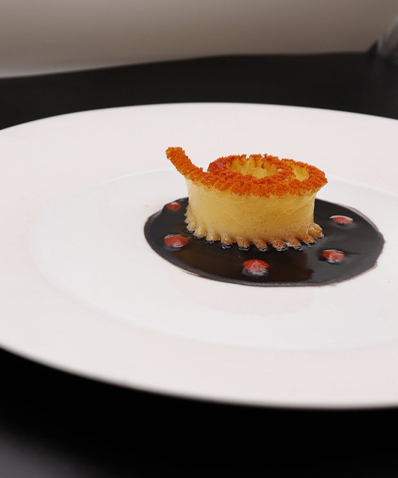 Grazie all’utilizzo delle più moderne tecniche, si ottiene una sottrazione di pomodoro totale, senza sprecarne alcuna parte, nemmeno i raspi; una salsa di pomodoro scura alla base, che ricorda l’odore dei fusti sui braceri dove si cuoce il pomodoro da conserva; un’acqua molto concentrata, che esalta l’acidità del pomodoro; una salsa rossa di pomodoro ridotta in sottovuoto senza applicare calore, per ottenere la parte dolce e fruttata. Finisce l’esperienza una nebulizzata di distillato dei raspi per esaltare l’odore erbaceo. Non vi è alcuna aggiunta di sale, in quanto si andrà ad estremizzare l’umami contenuto nel frutto, per ottenere la giusta sapidità del piatto.