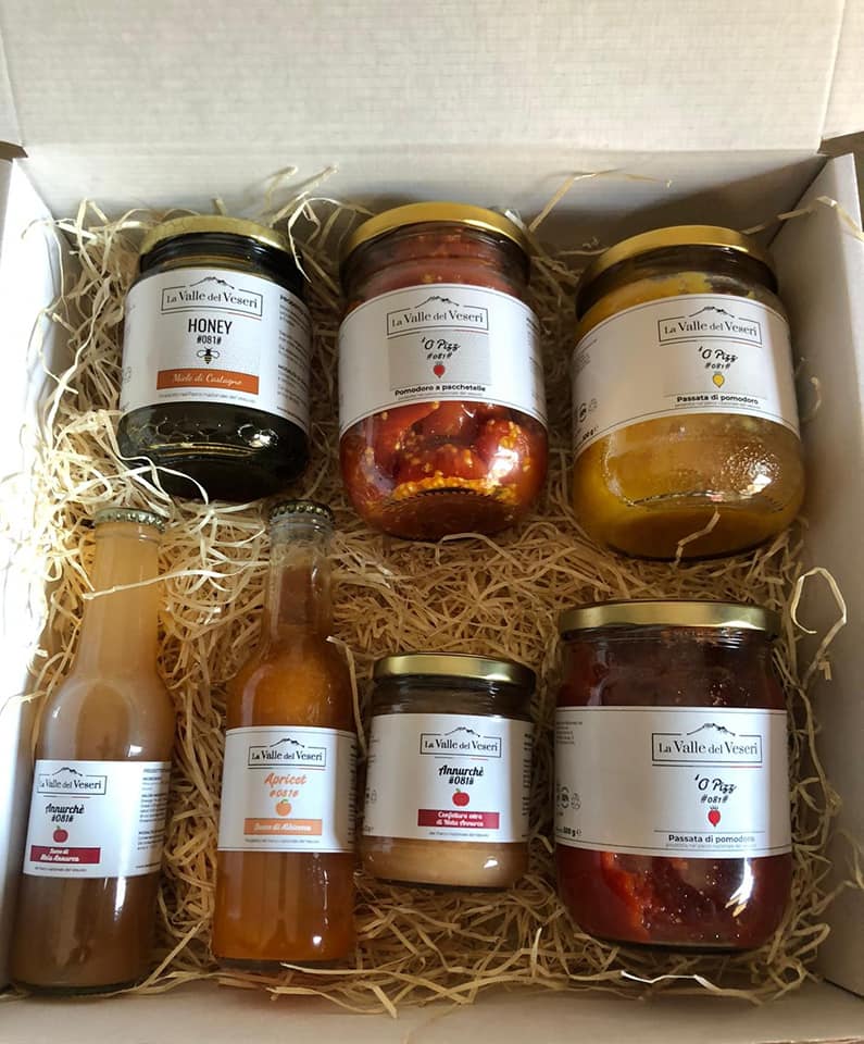 Nel cuore del Parco Nazionale del Vesuvio, Giovanni Ferraro oltre a preparare box con piennolo rosso e giallo al costo di 10 euro, non dimentica la sua natura di apicoltore e ha confezionato una box composta da 1 kg di miele (castagno, millefiori o melata) dal prezzo di 15 euro con spargimiele in omaggio e una box con 1 vasetto di miele da 250 gr + 1 vasetto di confettura di mela annurca da 220 gr al costo di 10 euro. La scatola pensata appositamente per Natale, può contenere miele, millefiori, succhi, conserve, propoli, zafferano, pacchetella o interno in acqua, conserva di pomodoro rosso e giallo e parte da un minimo di 25 euro per arrivare a 50 euro (facebook la valle del veseri)