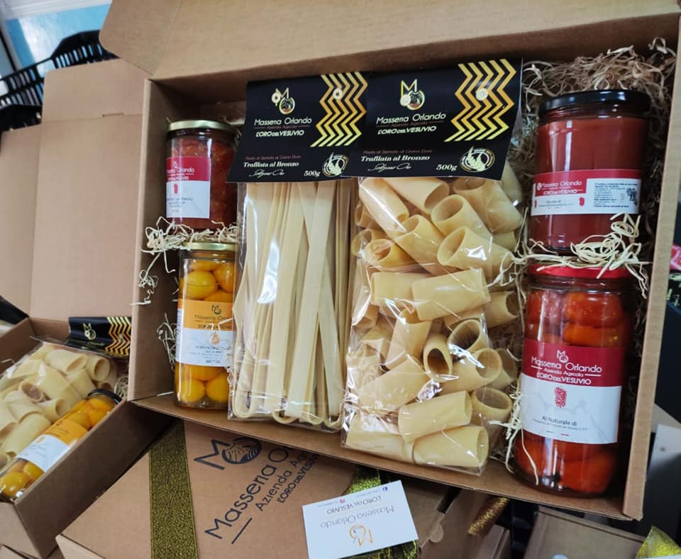 Le scatole di Marianna D’Auria, anima rock dell’impresa, partono da 10 euro come nel caso della “Nonna Cardella” Pasta Di Martino (2 pacchi di spaghetti Di Martino da 500 gr + 1 passata pomodorini bottiglia birra da 700gr + 1 ricetta della devozione dello chef Peppe Guida in una scatola dal packaging semplice, rossa dal fondo a pois e fiocco) e arrivano sino ai 45 euro della classica “Pomo Deluxe dei Campi” (1 spaghetto + 1 vermicello Pastificio dei Campi + 1 vaso vetro pomodorini di collina da 580 gr. + 1 vaso vetro pomodorini di collina a pacchetelle da 1000gr + 2 bottiglie tradizionali di passata di pomodori da 680 gr + 1 vaso vetro pomodorini di collina acqua e sale + ricetta della devozione dello chef Peppe Guida).