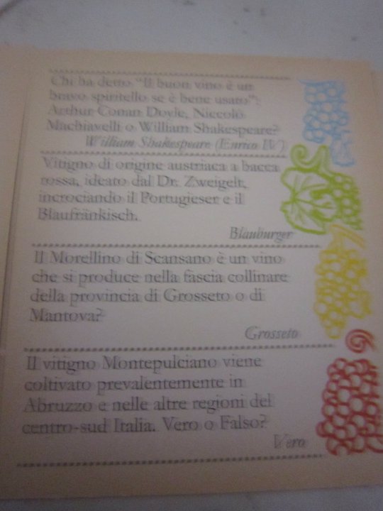 30 3/1/2011 Torna a: Regali non banali: Il grande gioco del vino esempio di una carta domanda , si risponde a seconda del colore dove ci si trova← PrecedenteSuccessiva →