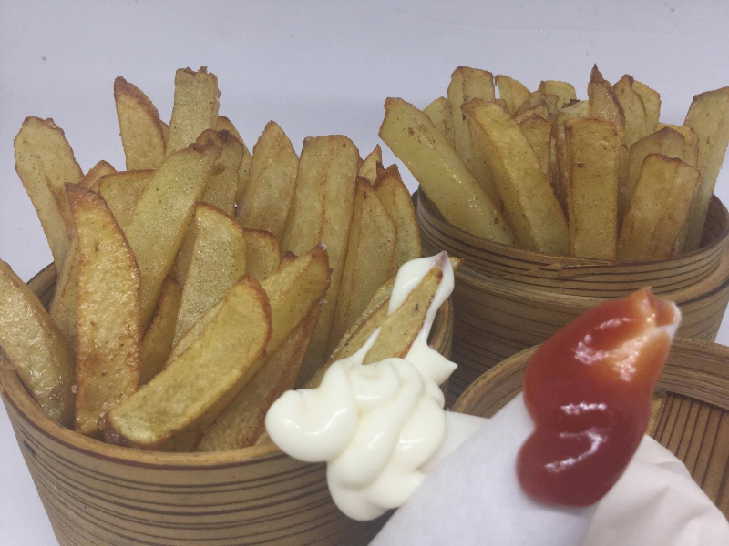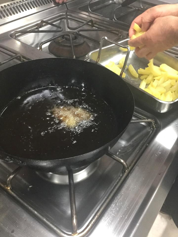 Tagliarle con la mandolina a stick e friggerle in olio di semi di arachide a 170°C.