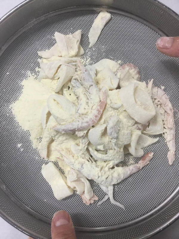 Infarinare il pesce con semola e farina, setacciare e friggere in olio temperato