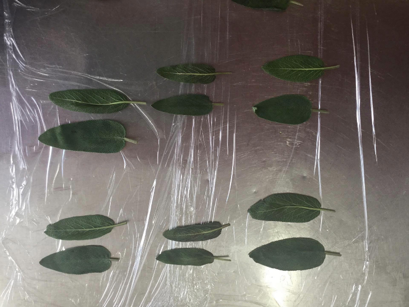 Presentare le foglie di salvia con sale e pepe di mulinello
