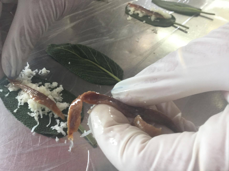 Lavare le foglie di salvia, sbianchirla in acqua salata, raffreddarle in acqua e ghiaccio