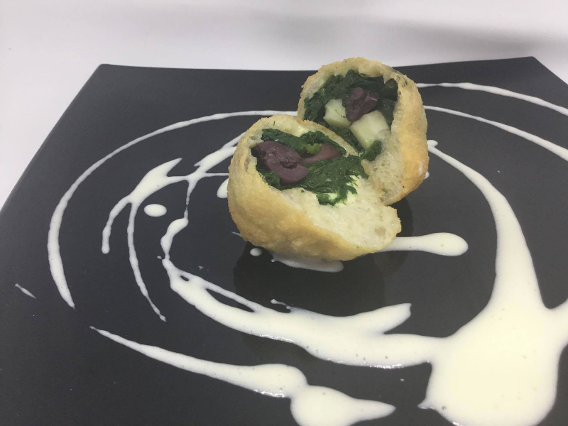 rivestire degli stampini semisfera di pasta pane, farcire con i friarielli, olive, provolone, chiudere ermeticamente la pasta, lievitare circa 30 minuti e friggere in olio temperato come da indicazione.