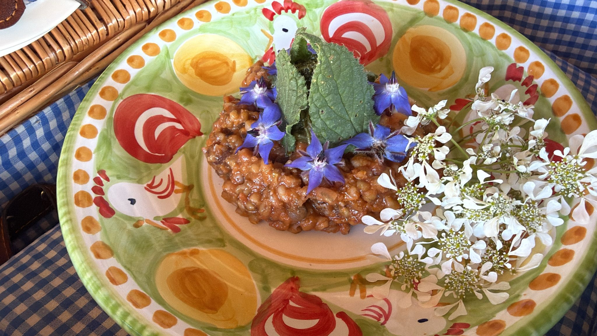 Oltre a legumi e orzo, Bianca arricchisce la zuppa con le amate erbe spontanee di cui è profonda conoscitrice, in questo caso la borragine, insieme ai suoi delicati fiori, un tocco di pomodoro e, a completare il tutto, il magnifico olio prodotto nella sua azienda agricola.