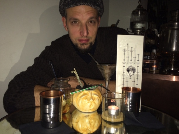 La sera dopo Thomas è con noi, e in una piovosa serata ci addentriamo nelle zone di Shoreditch e dintorni. Ci porta al Callooh Callay, localino affollatissimo, anche qua gli home made affiorano abbondantemente sul banco e la bottigliera è ben nutrita, lo staff è preparato e all’avanguardia, hard shake e throwing e servizio impeccabile dalle ricercate decorazioni, dove la drink list è un album di figurine, nel quale ci sono solo le descrizioni e l’immagine te la danno solo se consumi quel cocktail. A noi tre non ci ha dato nulla nessuno, comunque buona l’idea. Prendo uno “Zymology”: Tanqueray gin, Burdock bitters, Fermented green apple juice, Black sesame, Honey.