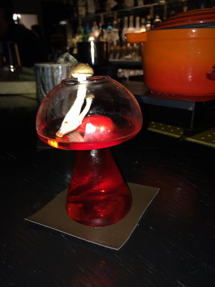 Servito, con una certa audacia, come variante Negroni, è un drink veramente ben fatto e equilibrato, sakè e cognac insieme possono convivere, marzapane e Campari completano il cerchio gustativo, al posto del ghiaccio abbiamo dei pachino congelati e immerso dentro un fungo commestibile con la cappella imbevuta di cioccolato.