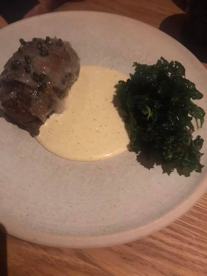 Il piatto con le aringhe, da cui siamo partiti, ne è un esempio: la cottura è perfetta, il topinanbur ha più una funzione dare un po’ di consistenza, la salsa regala acidità. Resteremo dunque sempre su toni acidi e amari, bruciacchiati aggiungiamo, che è un gusto che piace in modo particolare qui.