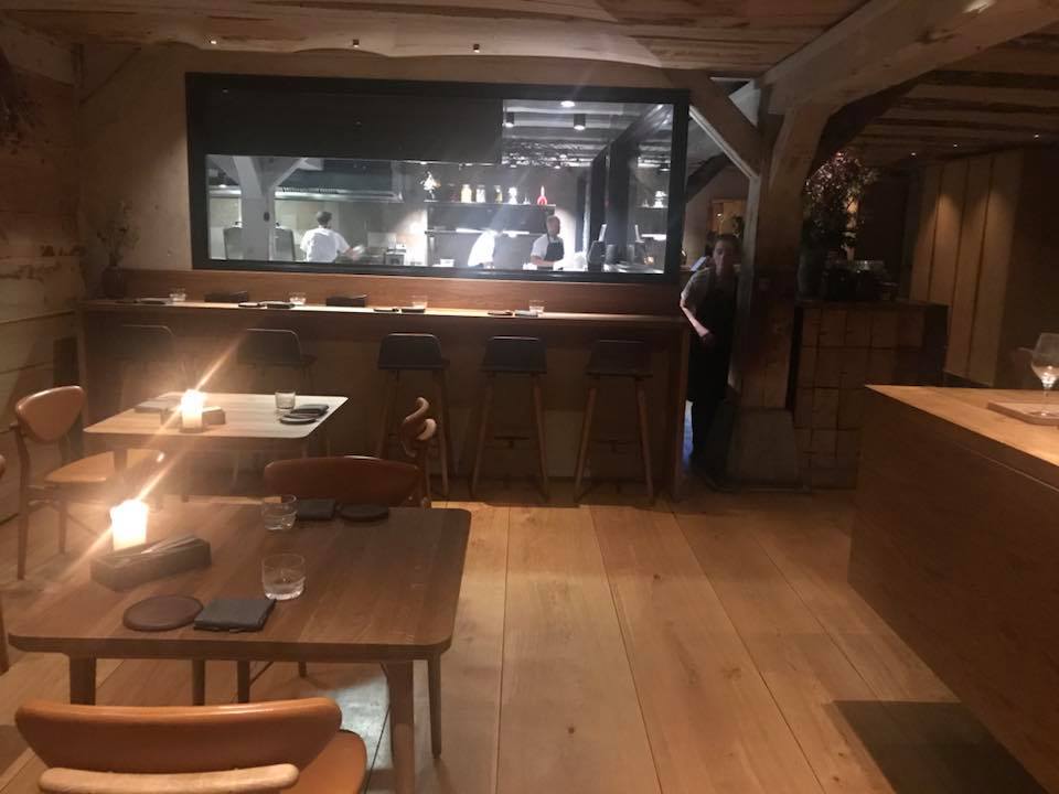Gli interni del Restaurant Barr sono stati disegnati da Peter Girgis dello studio Snøhetta, specializzato in architettura ambientale ed ecocompatibile. E infatti si entra subito in un locale caldo, accogliente, con qualche angolo Vecchia Copenhagen, due sale con un bancone comune, una con con le birre alla spina, l’altra di fronte alla cucina diretta da Thorsten Schmidt, amico di lunga data di Redzepi, già executive al Malling & Schmidt di Aarhus dove ha inventato il gelato alla quercia.
