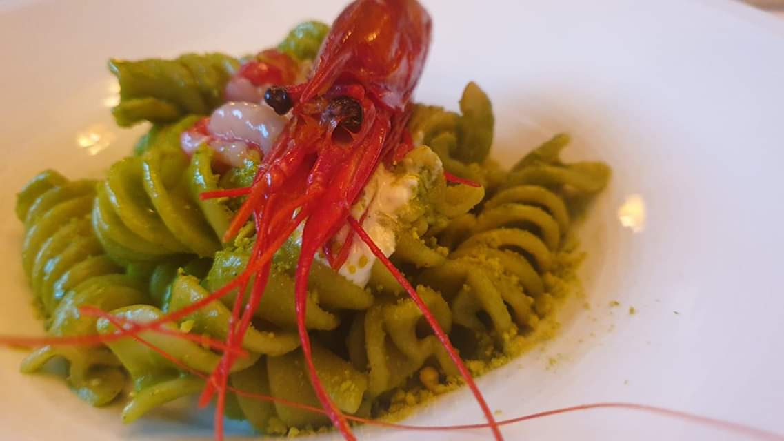 Lanfranco Paliotti di Evelina. Eliche Verdi, gambero rosso, burrata e pistacchio.