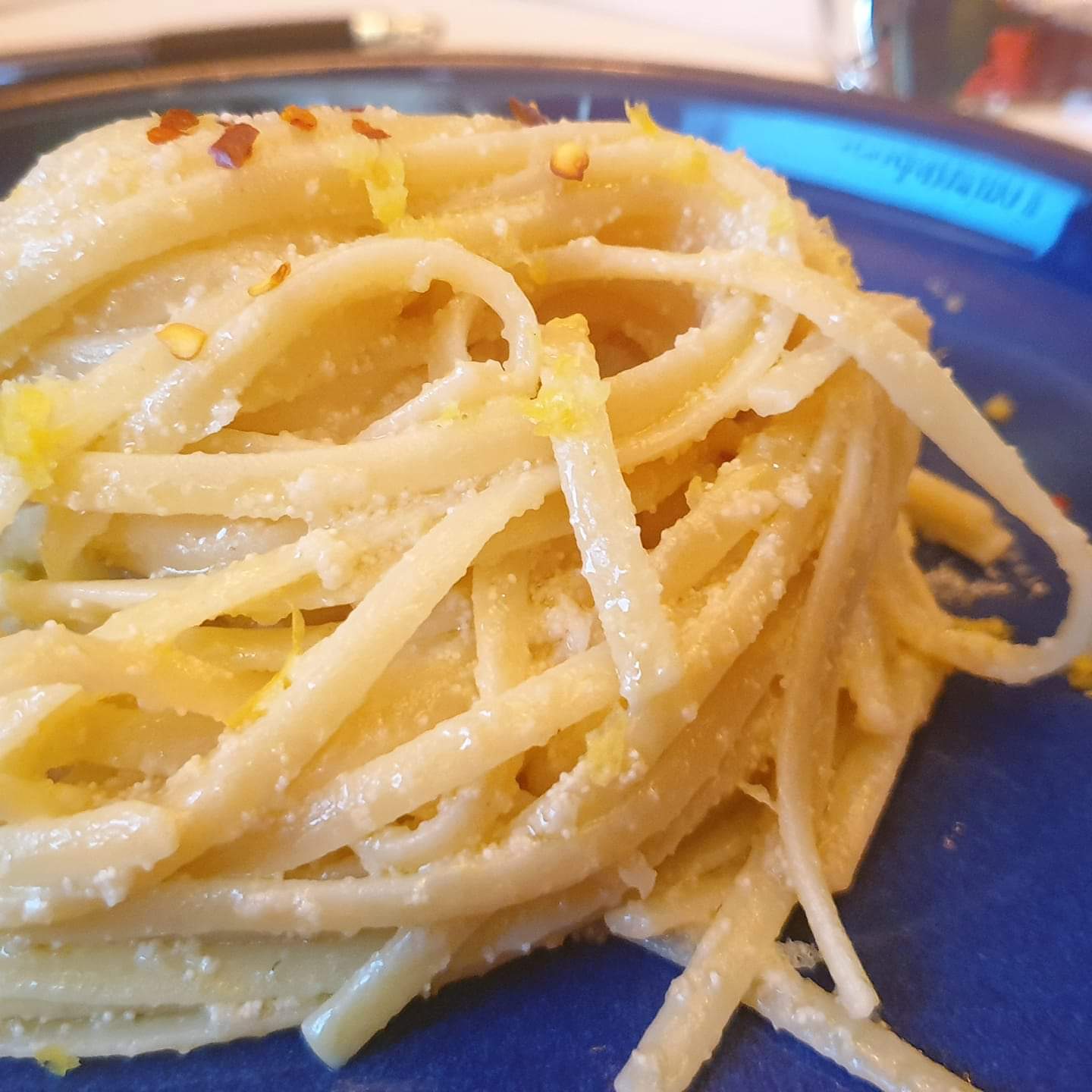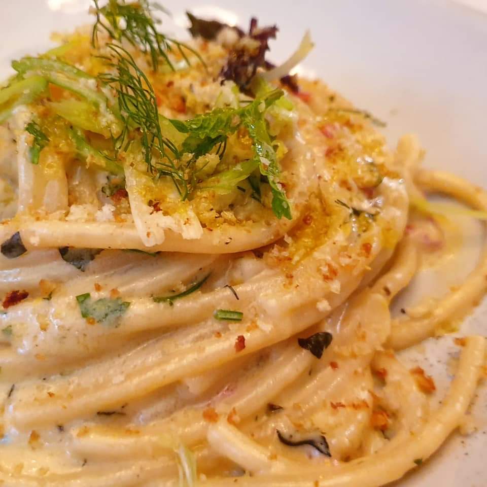 Riccardo Orfino di Osteria57. Bucatini, crema di cashew-kombu, pesto mediterraneo, limoni di Sorrento, pangrattato.