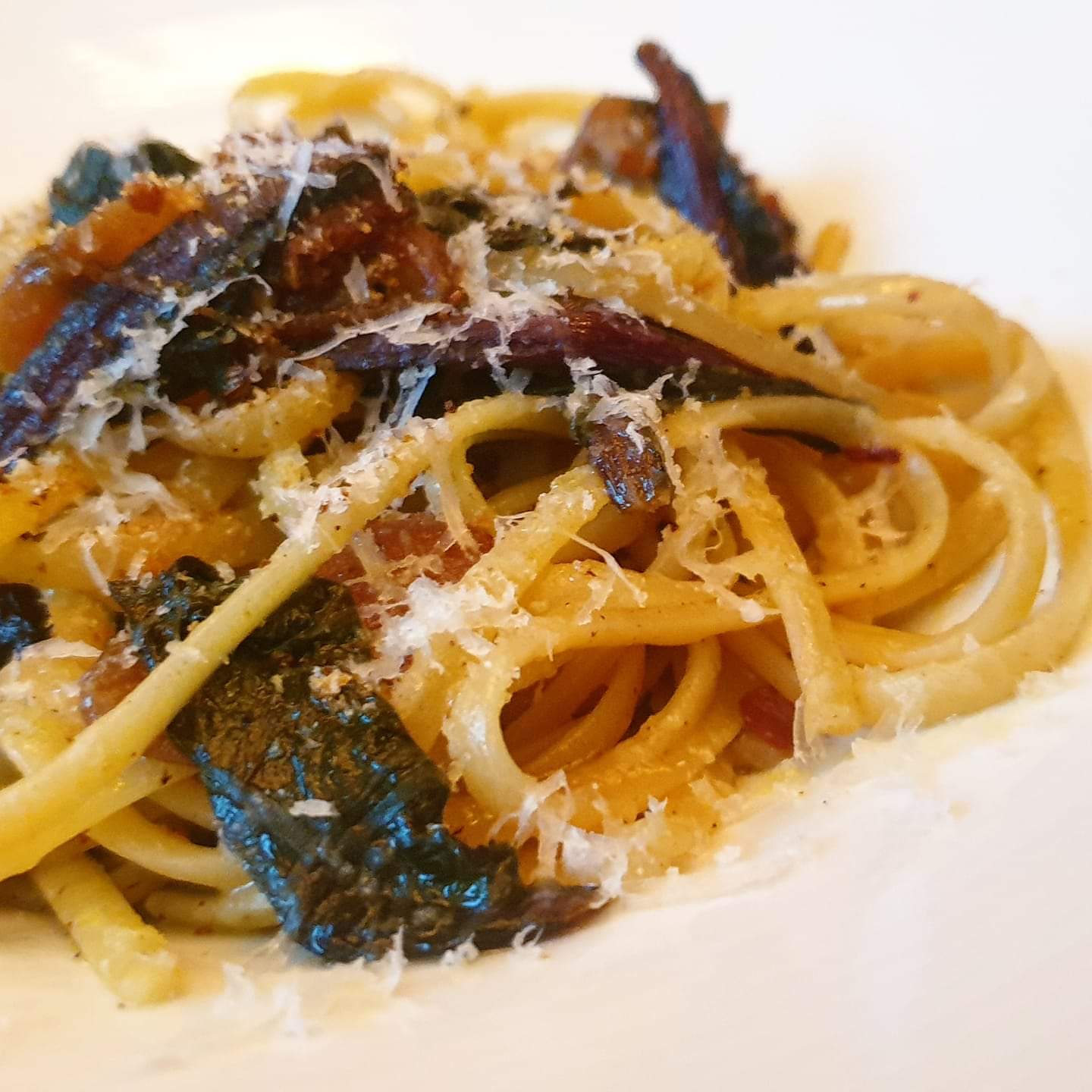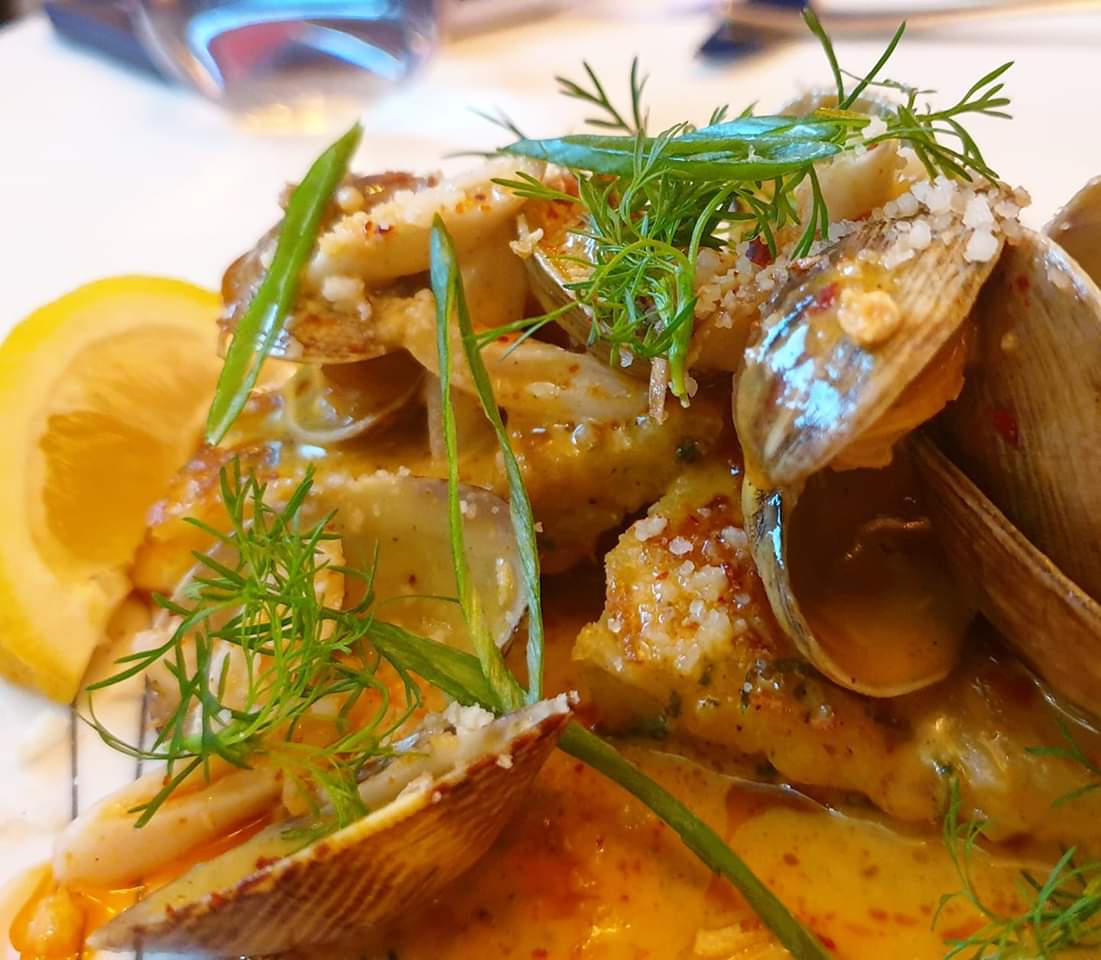 Pancake di pasta al cipollotto e salsa di vongole piccanti