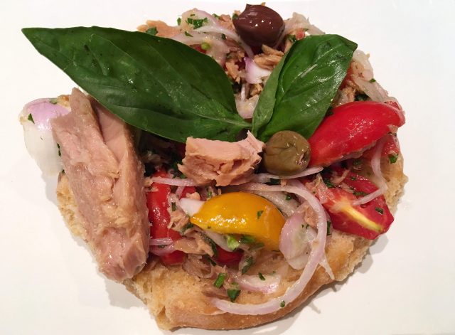 Bagnare le friselle, adagiare nei piatti e coprire con l’insalata.Terminare con le melanzane e i filetti di alici e irrorare con un giro di olio extravergine d’oliva.