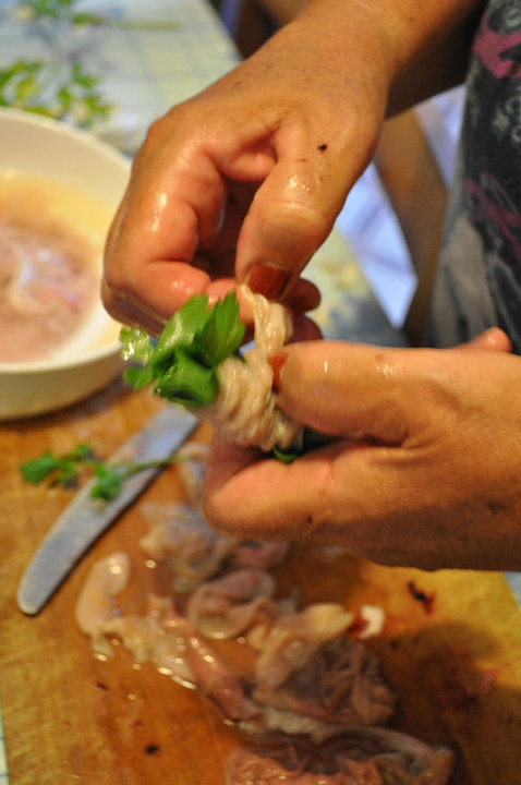 Aperto il ventre del coniglio si estraggono gli intestini, con delle forbici si aprono per tutta la loro lunghezza in modo da eliminarne le feci. Da prima lavati con abbondante acqua corrente, poi messi in ammollo con acqua e sale, cambiando l’acqua più volte. Infine si lasciano spurgare in acqua e succo di limone fino al momento della preparazione. Anche il ventre viene trattato allo stesso modo. Una volta strizzati ben bene da tutta l’acqua, Marilena con gesti rapidi e sapienti avvolge gli intestini attorno a ciuffi di prezzemolo, formando degli involtini che saranno poi cotti come gli altri pezzi.