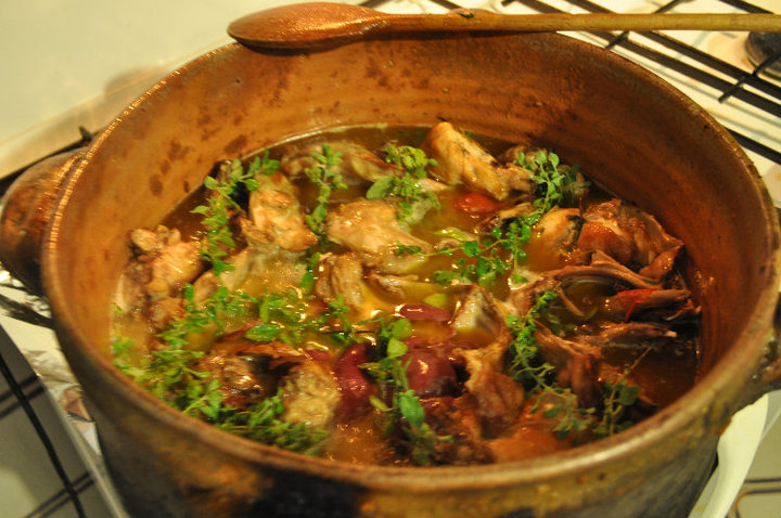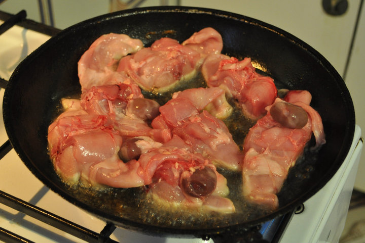 A questo punto si passa finalmente ai fornelli. Si versa dell’olio da frittura (preferibilmente semi di arachidi) in una padella, e appena è ben caldo si mettono i pezzi di coniglio a rosolare. In varie manches vengono fritti separatamente, prima le cosce di dietro, poi quelle davanti, poi i mezzi di mezzo, per finire con i colli, le teste, i codini ed, infine, gli intestini. Il fegato non va fritto, altrimenti indurisce troppo. I pezzi vanno girati una sola volta e sempre con posate di legno, quelle di acciaio potrebbero bucare la carne. La rosolatura è fondamentale per un buon risultato finale. Una volta formatasi quella crosticina dorata su entrambi i lati, i pezzi si scolano dall’olio in eccesso su carta assorbente in attesa di essere trasferiti nel tegame di creta.