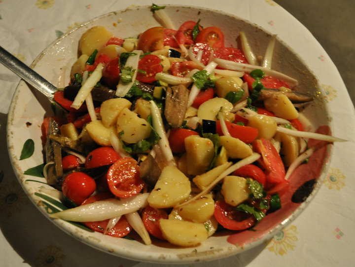 Nel frattempo, Mario si è allontanato per recarsi nell’attiguo orto. Torna con bel “canestro” colmo di pomodori da insalata, basilico, melanzane, peperoncini verdi e sedano. Da una pertica appesa tra i rami di un limone sfila un paio di teste di cipolla, di quelle dolci e lunghe, tipiche di queste parti. Dalla dispensa Mario tira fuori un barattolo di melanzane sottolio, il cui assaggio conferma l’ottima impressione che avevo avuto nell’esame olfattivo e visivo. Tutti questi ingredienti, insieme alle patate cotte al mattino, serviranno per preparare la classicissima “insalata cafona ischitana”. Forse è superfluo dire che tutte le materie prime, ma proprio tutte, sono “di casa”, definizione che qui equivale ad un autentico marchio d.o.p. a garanzia del consumatore.