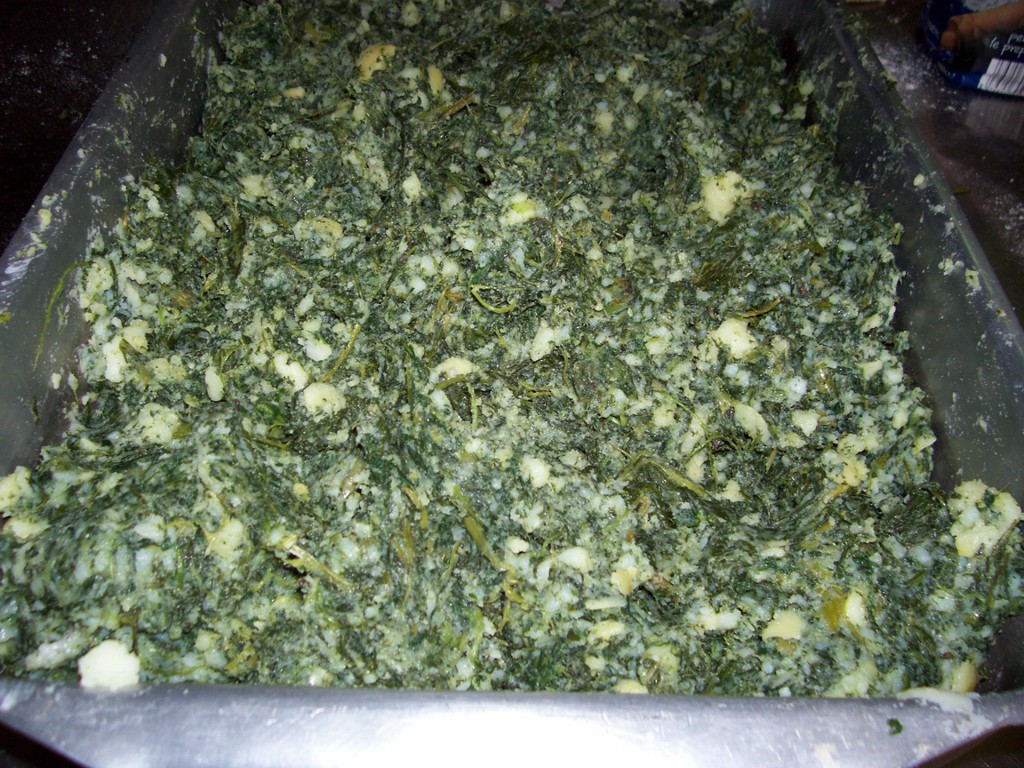 Dopo dieci minuti, strizzatele ben bene e formate delle palle da 7/8 cm di diametro, a mo’ di mallo di noce ( da qui mallone). Intanto nell’acqua di cottura delle rape, evitando così di sprecare acqua ed energia per riscaldarla di nuovo, lessate le patate. Quando sono cotte, prima che si raffreddino, togliete la buccia e amalgamatele, impastando con le mani, con le rape precedentemente tagliuzzate in una teglia .