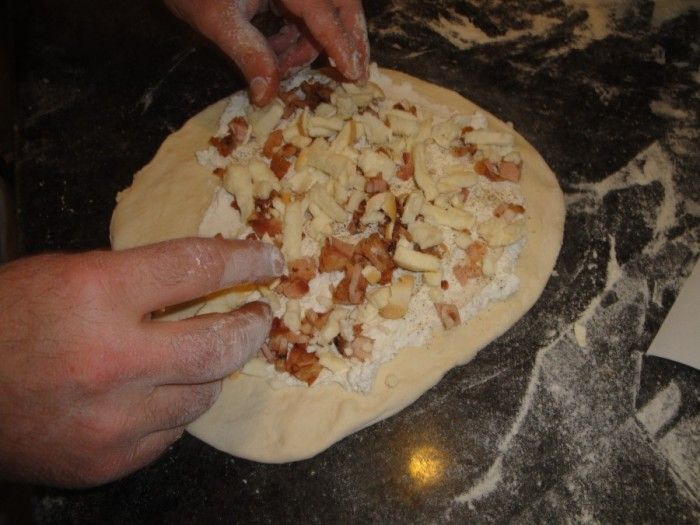 nell’acqua sciogliamo il lievito a cui aggiungiamo una parte di farina e poi il sale. Cominciamo a lavorare bene il composto ottenuto aggiungendo poco alla volta il resto della farina. Lavoriamo energicamente fino ad ottenere un impasto omogeneo e morbido. Lasciamo lievitare e riposare qualche ora ( due o tre sono sufficienti) coprendo l’impasto con un panno di cotone ben pulito in un ambiente non freddo ( la quantità di acqua indicata è orientativa, se l’impasto dovesse risultare troppo duro, aggiungere altra acqua in piccolissime quantità). Quando i panetti avranno raddoppiato il proprio volume, sono sufficienti due o tre ore, stendiamo i dischi di pasta, al centro vi spalmiamo bene la ricotta utilizzando una spatola oppure un cucchiaio, poi aggiungiamo provola e cicoli tagliati a cubetti e condiamo con sale e pepe. Ripieghiamo la pasta su se stessa facendo bene pressione sui i bordi con le dita. In una grossa padella facciamo riscaldare bene abbondante olio di semi di arachidi nel quale friggeremo le nostre pizze ripiene per poco più di 1minuto. Adagiarle subito su carta assorbente e servire ben calde, magari nella caratteristica carta paglia.
