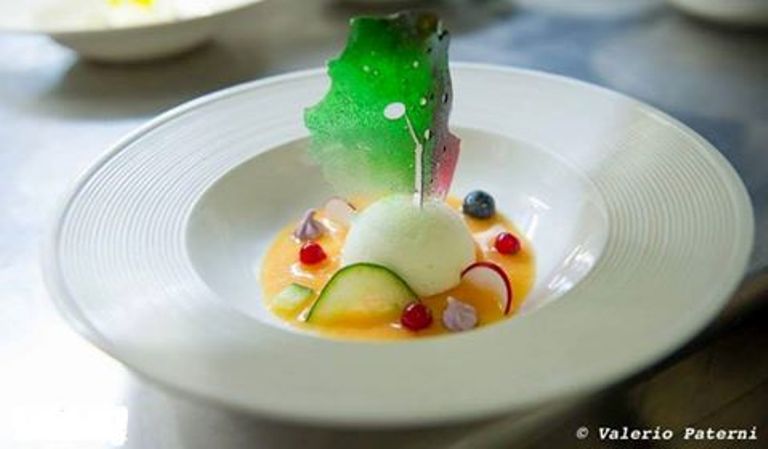 Il Limone amalfitano in acqua di arance con frutti di bosco, meringa al cavolo viola, cetriolo e ravanello – foto di Valerio Paterni