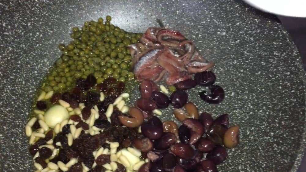 Prendiamo una padella e mettiamo olio evo, lo spicchio d’aglio facendo soffriggere con le olive nere, l’uva passa, i pinoli, i capperi e le Alici di Menaica (precedentemente spinate e lavate sotto acqua corrente). Un paio di minuti in cottura ed uniamo alla scarola. Controlliamo se nella scarola c’è residuo d’acqua così la scoliamo.