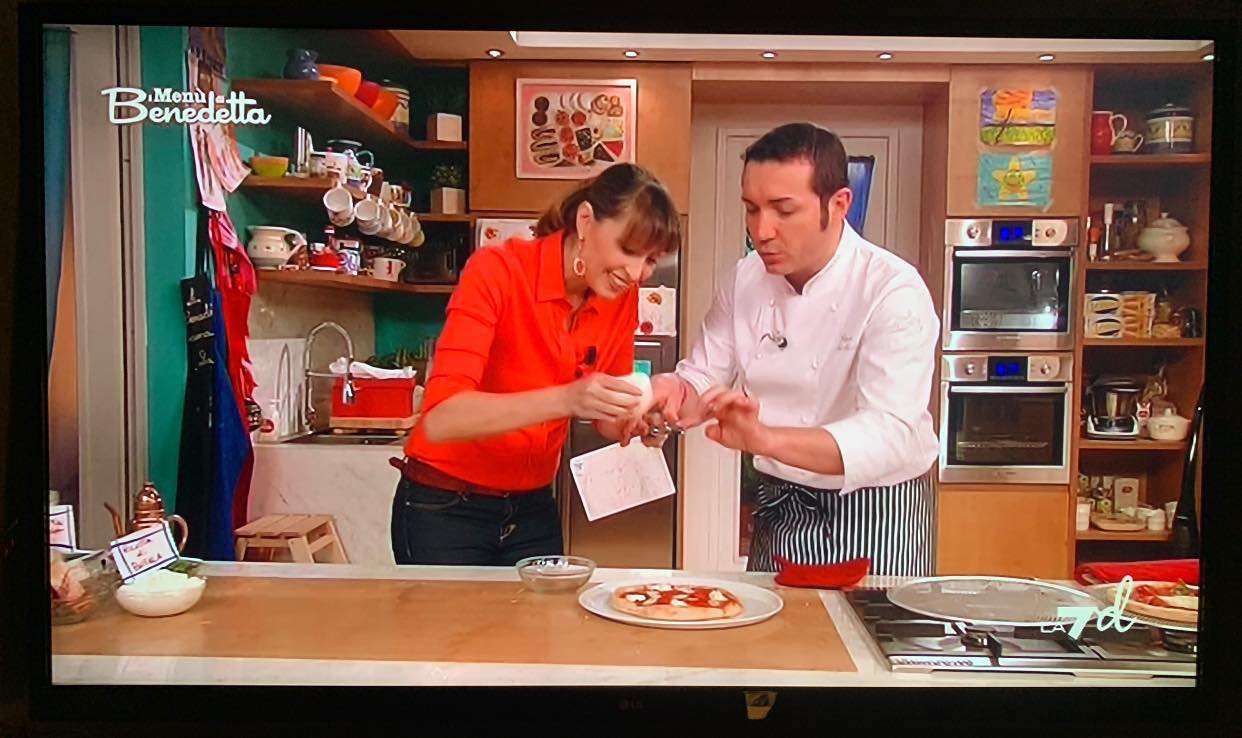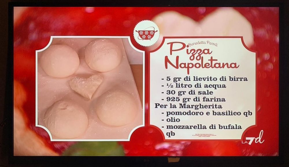 Gino Sorbillo con Bendetta Parodi in Tv per fare la pizza in casa. Nel riquadro vedrete gli ingredienti che hanno usato. Noi vi diamo un’altra versione quando i numeri di persone sono più alti, sempre del famoso pizzaiolo napoletano, con il fior di latte al posto della mozzarella di bufala.