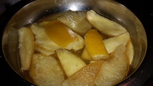 - Quando lo sciroppo avrà bollito per qualche minuto, lasciar intiepidire e versarlo sulle bucce, lasciandole così coperte per un’intera notte.