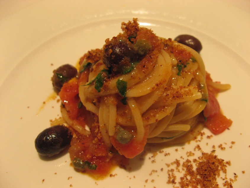 In una fondina versare una porzione di spaghetti e guarnire con il pan fritto.