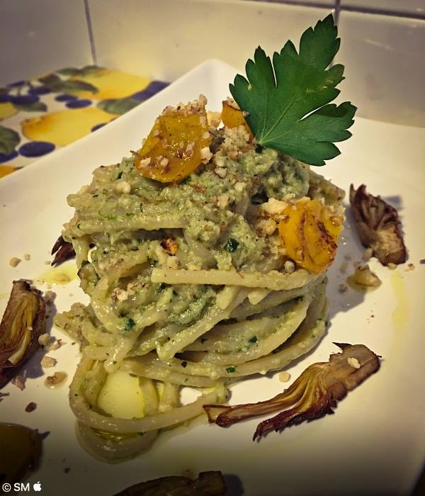 Rimuovete i datterini dalla prima padella, aggiungete un filo di olio EVO, una goccia d' acqua di cottura e i vermicelli e fate saltare; aggiungete il composto di carciofi passato al mixer e lasciate insaporire per qualche istante.