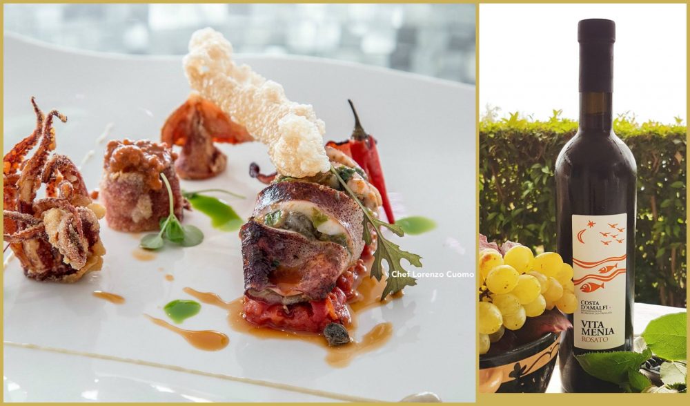 Il primo stellato che si incontra quando si va per i tornanti della costa d’Amalfi è il Re Maurì, sito proprio alle porte della Costiera, più precisamente sulla rotabile che da Salerno porta a Vietri. Al comando in cucina c’è Lorenzo Cuomo, un giovane chef con origini furitane, cresciuto fra i fornelli ed amante dei cibi semplici e genuini. Le sue proposte si fondano sulla tradizione ma anche su tanta tecnica, quella che Lorenzo utilizza nei suoi piatti poco artefatti ma che evidenziano i prodotti locali e gli antichi metodi di preparazione, cercando di suscitare curiosità e desiderio. Assieme al sommelier Roberto Adduono, hanno scelto il Vitamenia dell’azienda Vigne di Raito, un rosato ottenuto da uve Piedirosso ed Aglianico che ben racchiude i caratteri salienti dei vini costieri, dove continua è l’esposizione al sole ed i vigneti si affacciano sul mare sotto lo sguardo attento della titolare Patrizia Malanga. Lorenzo Cuomo con il suo “Totano imbottito” ricordando l’antica ricetta praianese. Nel piatto la contrapposizione della croccantezza dei totani con quella del loro ragù con accompagnamento le acciughe, il peperoncino, la scarola, le olive e gli immancabili pomodori.