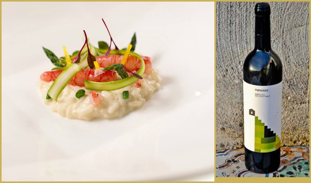 Un ristorante collocato su una massa rocciosa un po’ come uno scrigno, nascosto dalla macchia mediterranea e gestito dalla famiglia Ferrara. In cucina c’è Pierfranco, uno che ha lavorato nei migliori ristoranti francesi, toccando con mano le tre stelle Michelin e portando a casa tanta tecnica che mette in pratica nella sua di cucina, riuscendo a trovare spunto per piatti a regola d’arte. La sua stella brilla senza mai smettere di farlo, con determinazione e professionalità. Data la vicinanza ai vigneti, ha scelto in accordo con il sommelier Antonio Pappacoda, il vino bianco “Puntacroce” dell’azienda Raffaele Palma, collocata a pochi passi dal locale stellato e certificata dal marchio biologico. Un mix di uve locali come Falanghina, Biancolella, Ginestra ed altre uve autoctone, per un bianco fine dai forti sentori agrumati e dalla giusta sapidità e mineralità. Per questo vino Piefranco Ferrara ha deciso di abbinare un risotto mantecato con burrata e mozzarella di bufala , limone sfusato amalfitano , gambero rosso di Mazara crudo ,colatura di alici di Cetara ( 18 mesi di barrique) ed asparagi croccanti. Un tripudio di consistenze e contrasti che si sposano, alla perfezione!