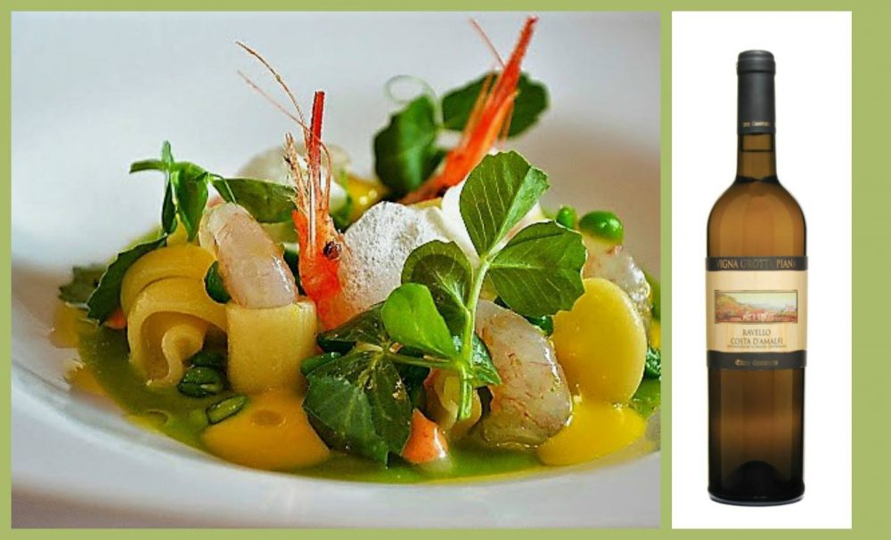 In un tour di curve e panorami mozzafiato, arriviamo a Ravello dove presso l’elegante Hotel Palazzo Avino, brilla fra i fornelli la stella del ristorante Rossellinis gestito da Michele De Leo, uno chef che ha fatto della tradizione, l’elemento portante della sua carriera. Attraverso il grande equilibrio che riesce a creare fra gli ingredienti locali e l’innovazione, De Leo riesce ad ”educare” i palati di tutto il mondo alla cucina partenopea, con estrema semplicità e raffinatezza – d’altronde le numerose esperienze fra gli stellati d’Europa, hanno fatto la loro parte. Dimostrazione della sua filosofia, è la pasta e piselli che, con parere del sommelier Enzo Falcone, ha abbinato al vino “Vigna Grotta Piana” di Ettore Sammarco. Ciò che potrebbe sembrare un semplice primo piatto, è invece un misto di formati di pasta, così come tradizione vuole, servito con gambero gobbo, guanciale e piselli crudi e cotti serviti assieme ai loro germogli. Il vino bianco che si va ad abbinare, ha un bouquet che spazia dal fruttato al floreale, elementi questi che aiutano il piatto ad aprirsi con tutti i sapori, evidenziandone le caratteristiche principali e i sapori primari degli ingredienti stessi.