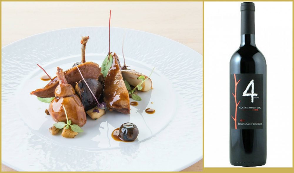 La sua proposta è un piccione con porcini e mirtilli: un po’ come per celebrare i monti che si incontrano con il mare, come accade per la bella Positano, ma anche per omaggiare il vino scelto, quello di Gaetano Bove della Tenuta S. Francesco.